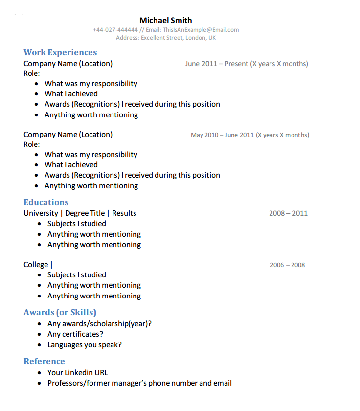 如果你有工作经验的话,不要吝啬,请大大方方地放在简历的前面。如果你只有校园社团或是打工的经验,那么可以适当地放在学历之后。我见过有些学生本来有些很好工作经验,简历上却把 70% 的内容用来描述毕业论文的课题,学过的科目和每个科目里覆盖的内容。如果一个学生在大学期间在麦当劳打了3年工(半职),并升到了副主管的职位,或是连续得到最佳员工奖,对于招聘者来说,这样的经历远远比你在社会学这门课上拿了90分要有价值得多。