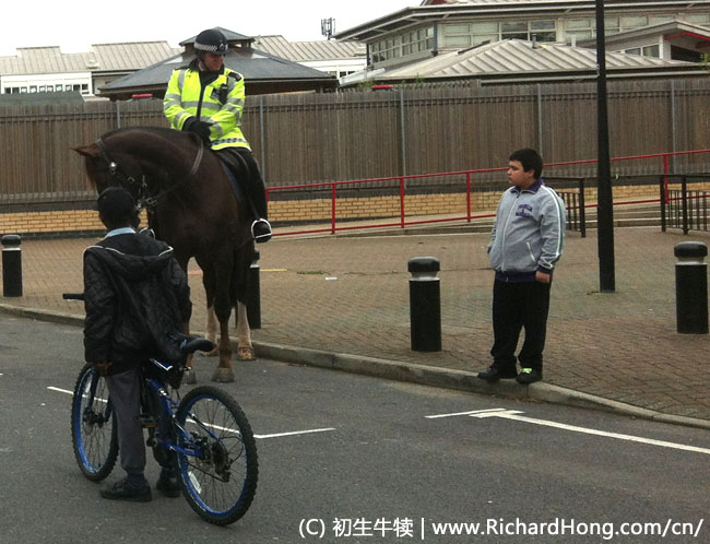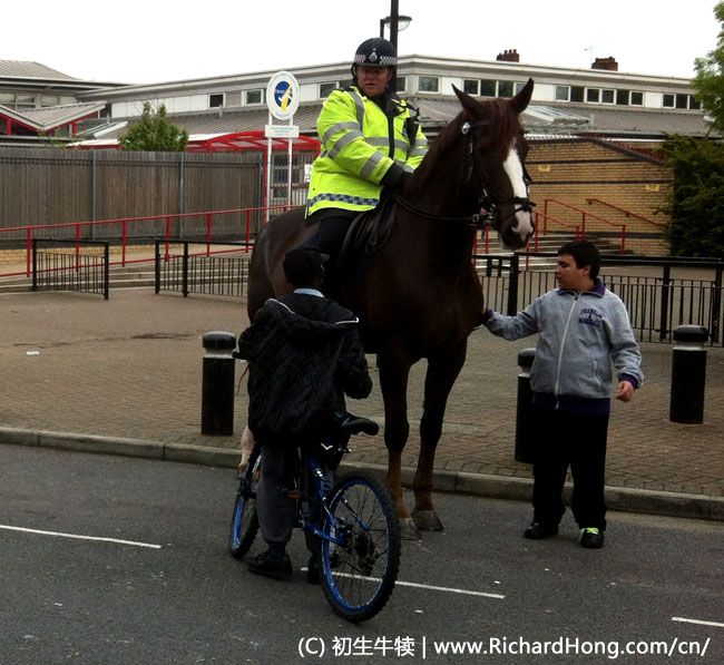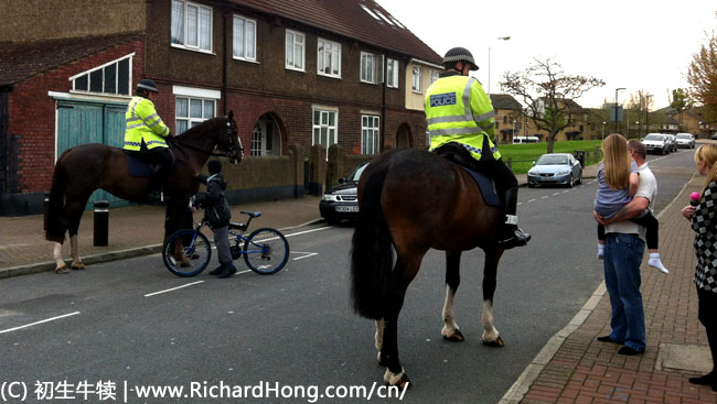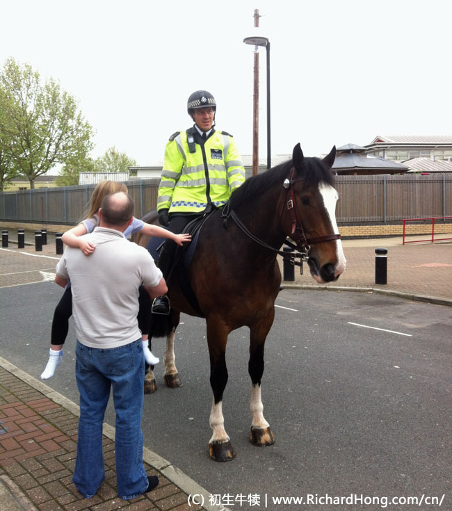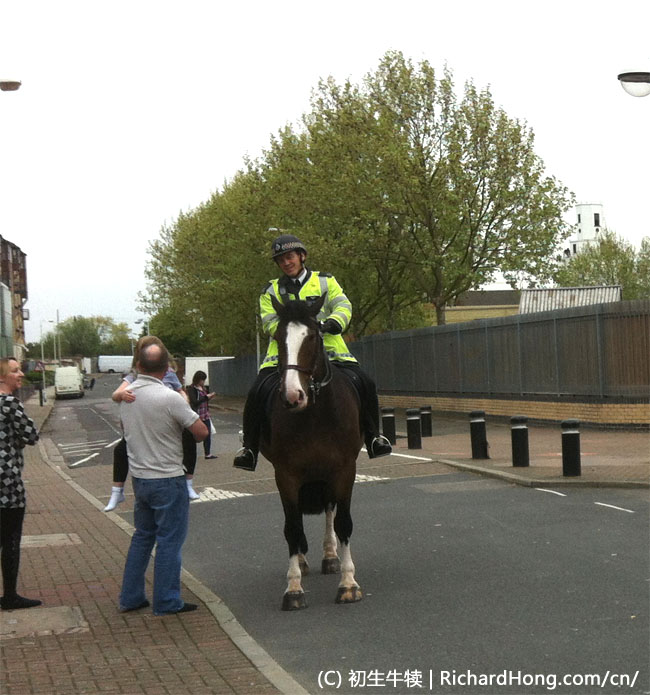 这两天在住宅区附近看到,想必是因为伦敦奥运的缘故。因为住在 Excel 会场的正对面,到时的警备可想而知。最近马儿出动,估计是为了到时行走路线的演戏,同时也跟附近的居民打好关系。